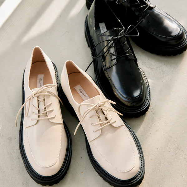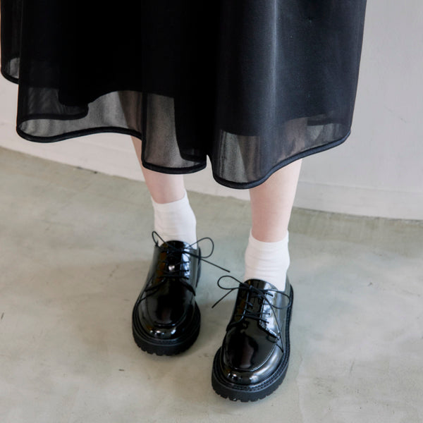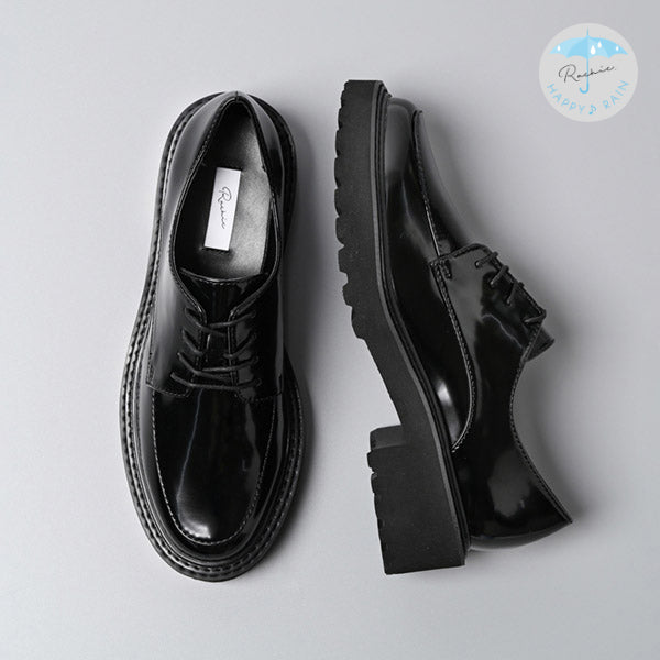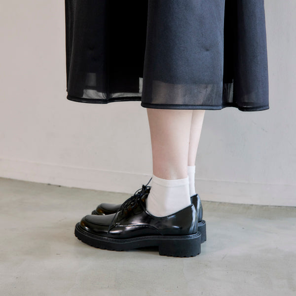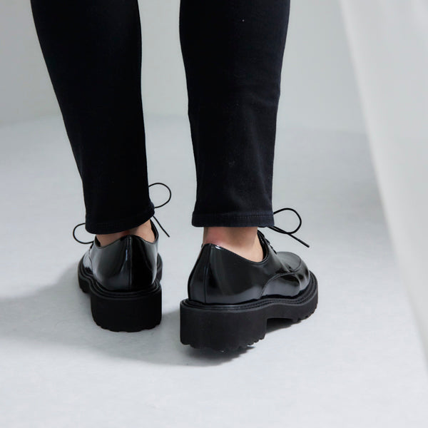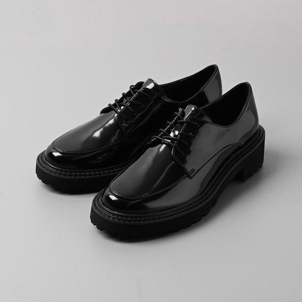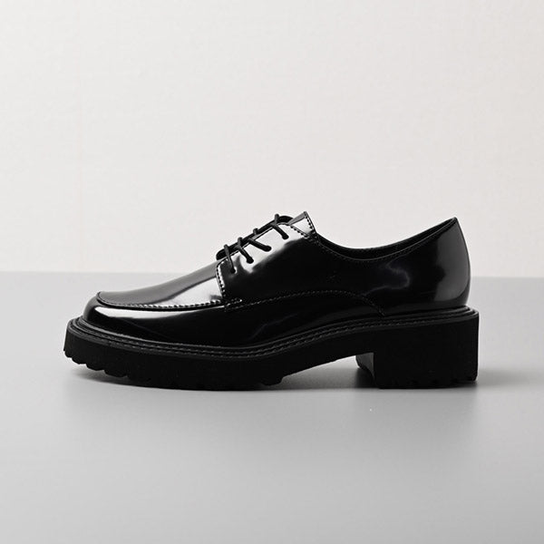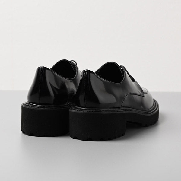 フォーマルなイメージの紐靴とカジュアルなボリュームソールの無敵の組み合わせで、ONにもOFFにも。ガラスレザー調の光沢がコーディネート映えします。マニッシュスタイルにもキレイ目にも合わせやすく、オフィスでのきちんと感にも対応でき、持っていて損はない一足。汚れ落ちしやすく、雨の日でも気軽に履いていただけます。