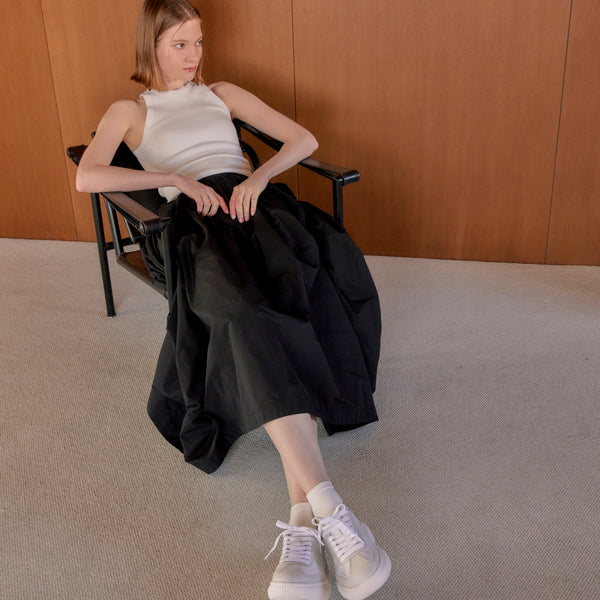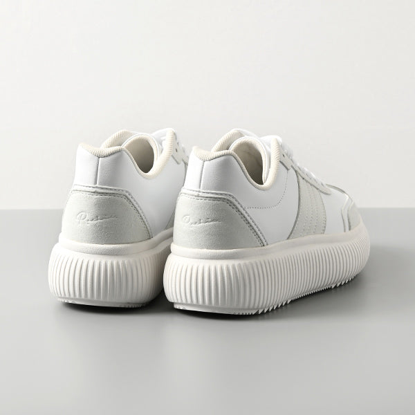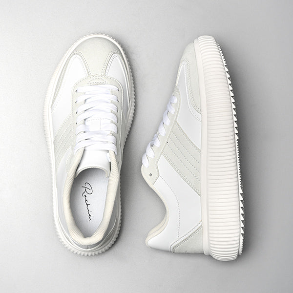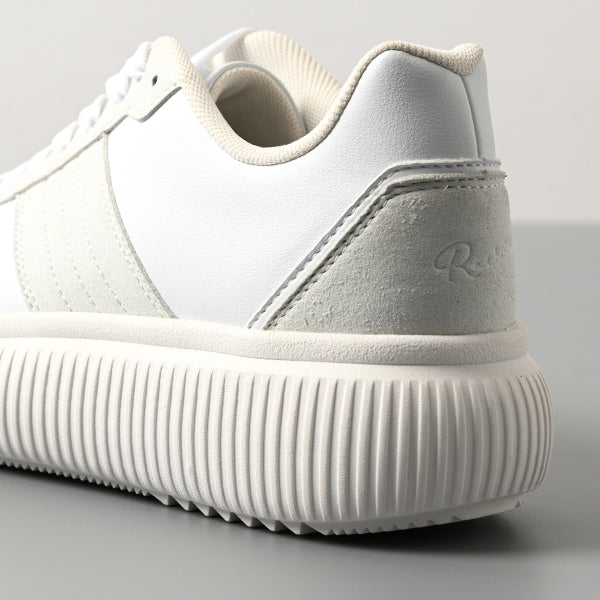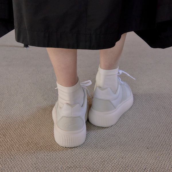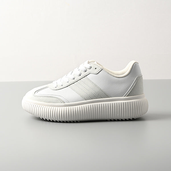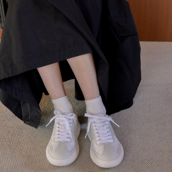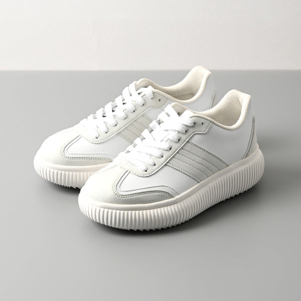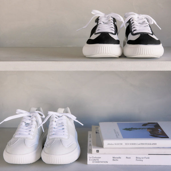 足元に上品な存在感をプラスしてくれる程よいスポーティー感が「今」っぽい、大人に似合う快適スニーカー。 アッパーはスムースとスウェード調を組み合わせ、素材の違いでコントラストをつけた洗練感のあるモダンなデザインです。 縦ラインが効いた4cmの厚底ソールは、自然とスタイルアップを叶えつつさりげないアクセントに。 シューズの内側全体に滑りにくく湿気を逃がす素材を使い、つま先には速乾吸収性の高い素材を使用している為、ムレを感じにくく快適な履き心地を実現。 ホワイトベースに黒を効かせたミックスと清涼感溢れるニュートラルなホワイトの2色をご用意しました。 いつものカジュアルコーデを格上げしてくれる、絶妙なモード感が手に入る一足です。